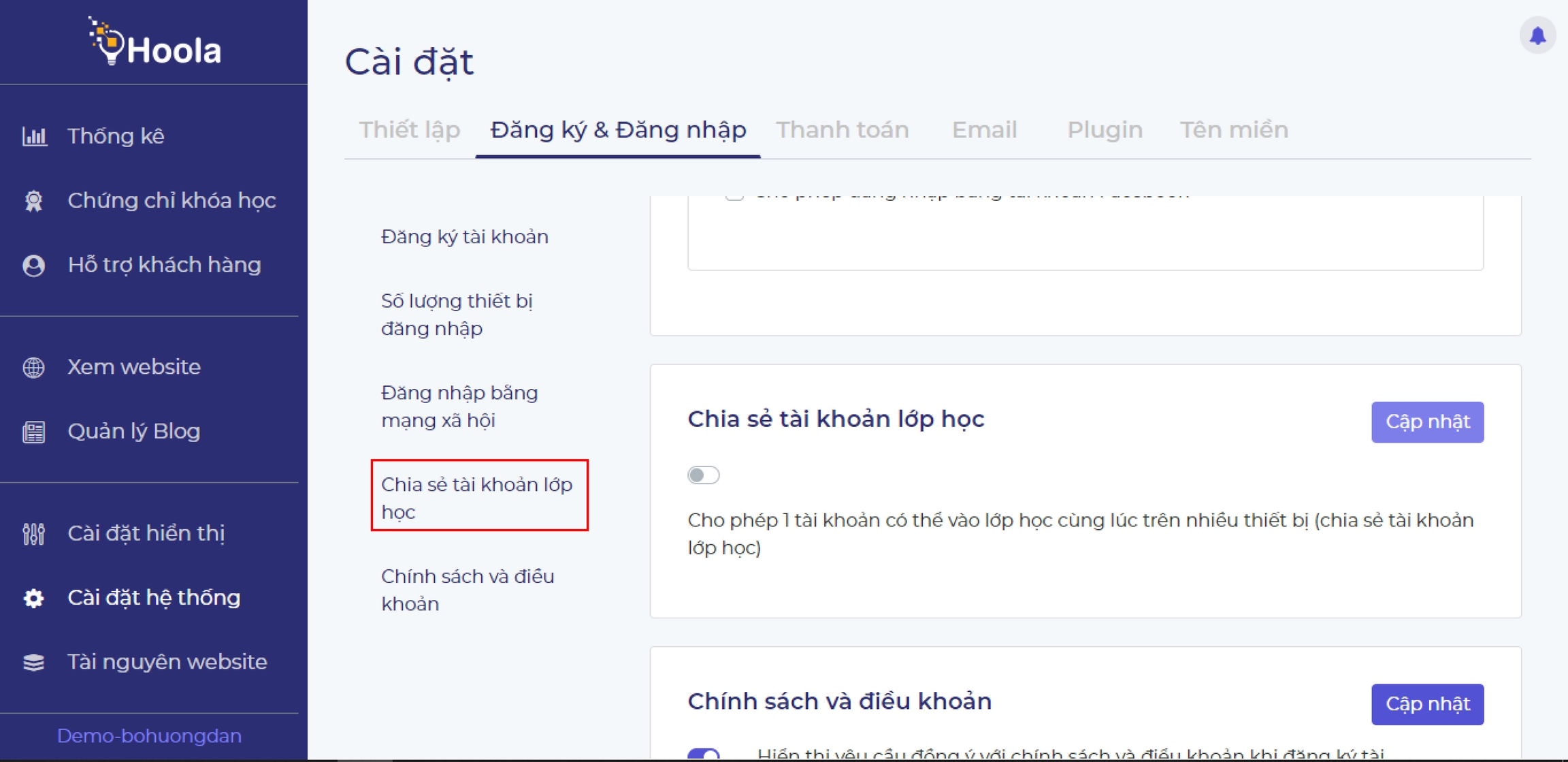 Cài đặt cho các sections khác nhau vào học cùng một lúc. 01 tài khoản có thể vào học cùng lúc trên nhiều thiết bị (nếu bật) hoặc 01 tài khoản chỉ có thể học trên một thiết bị trong một thời điểm (nếu tắt - mặc định), đồng nghĩa các thiết bị muốn vào học phải nằm trong các khung giờ khác nhau.