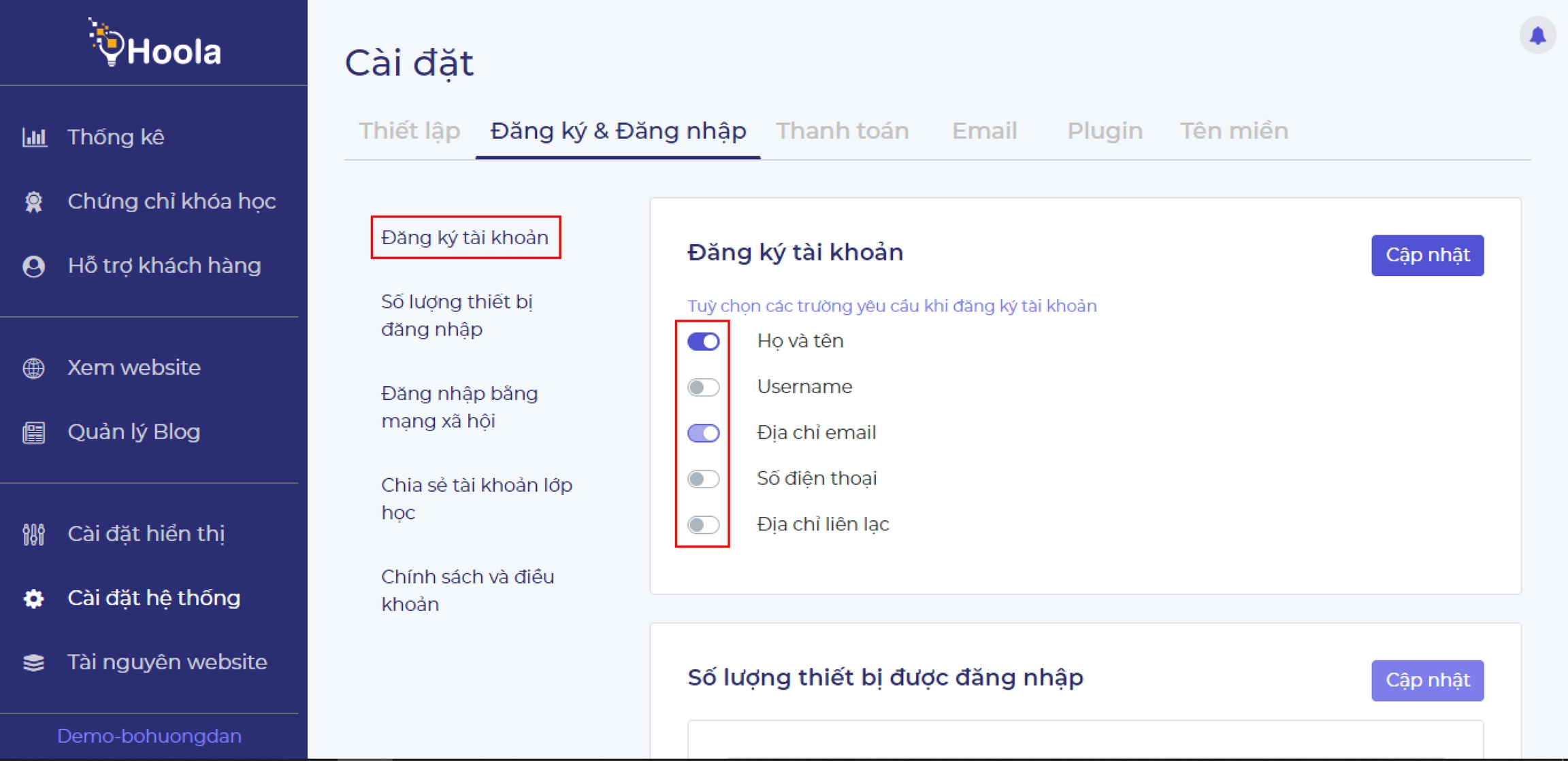 Mỗi website khi mới khởi tạo đều có những trường cơ bản như Họ và Tên, Địa chỉ Email, nhà quản trị web có thể bật/tắt các trường theo nhu cầu.