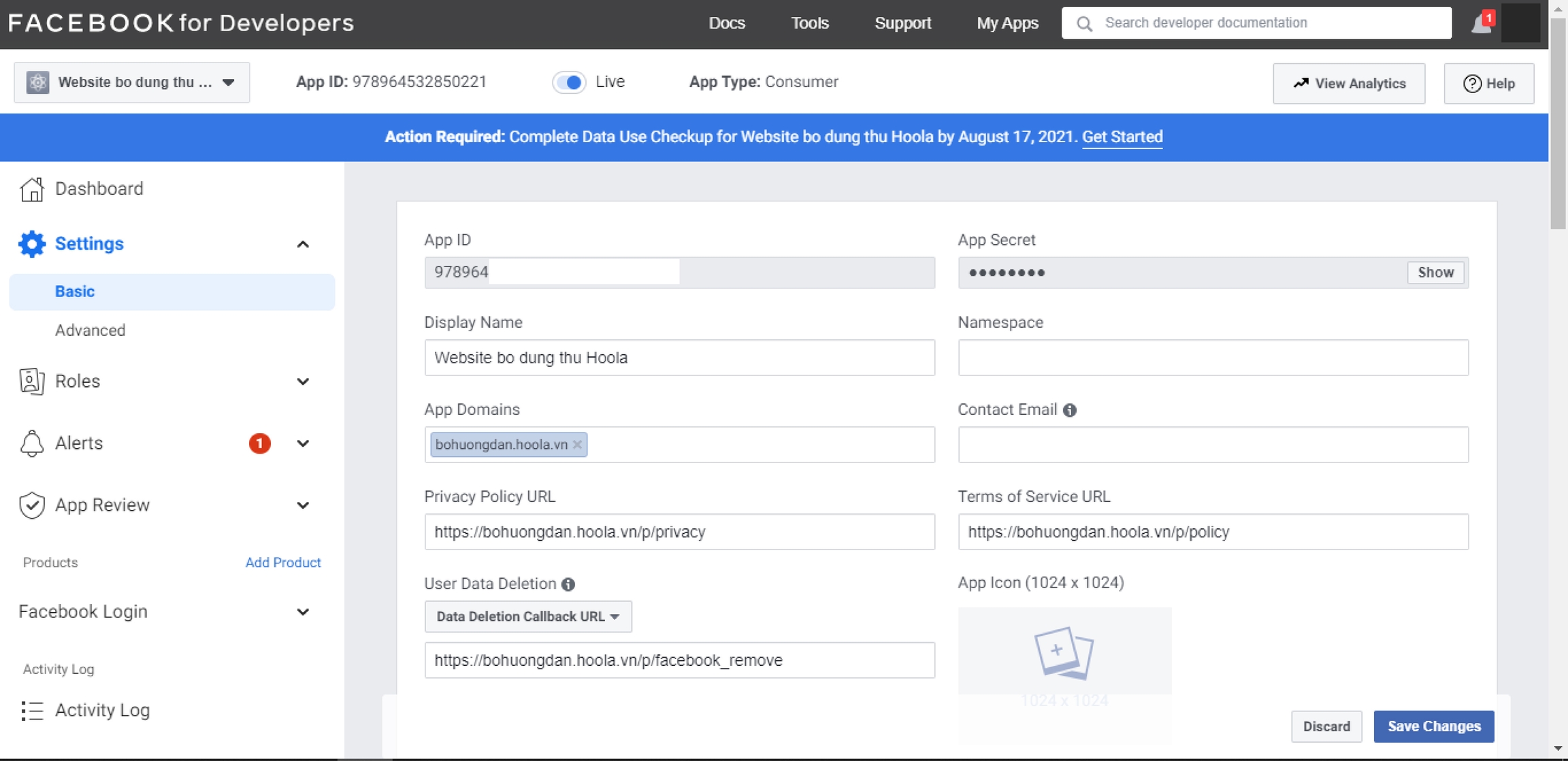 Terms of Service URL: Điền đường dẫn đến phần Điều khoản sử dụng trên website