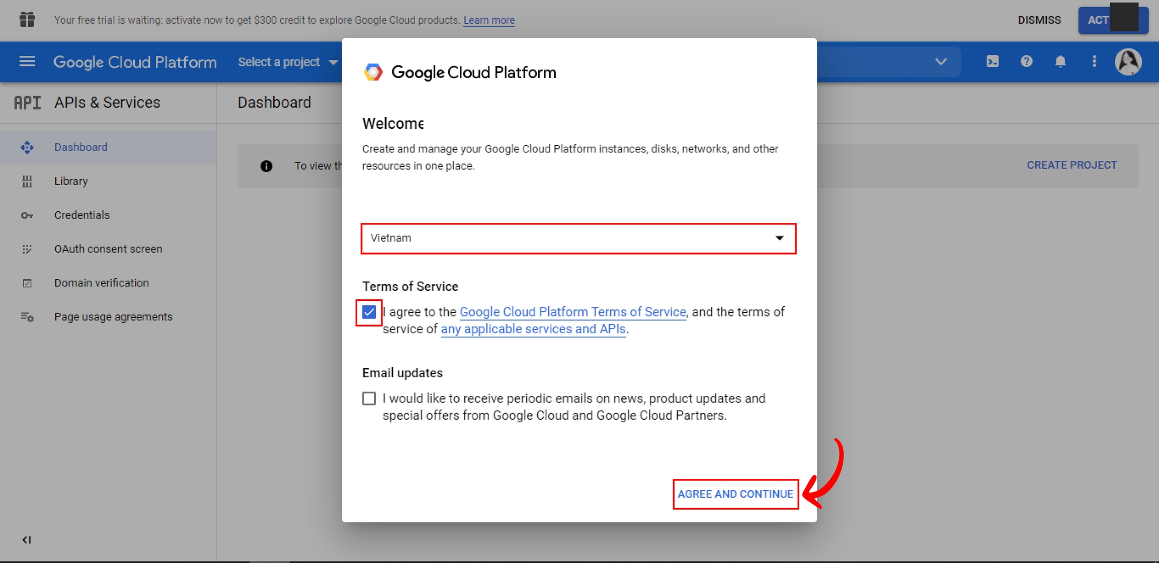 Khi trang web Goolge Developers Console hiện lên, web sẽ yêu cầu chúng ta đồng ý chính sách của họ. Chọn country Vietnam