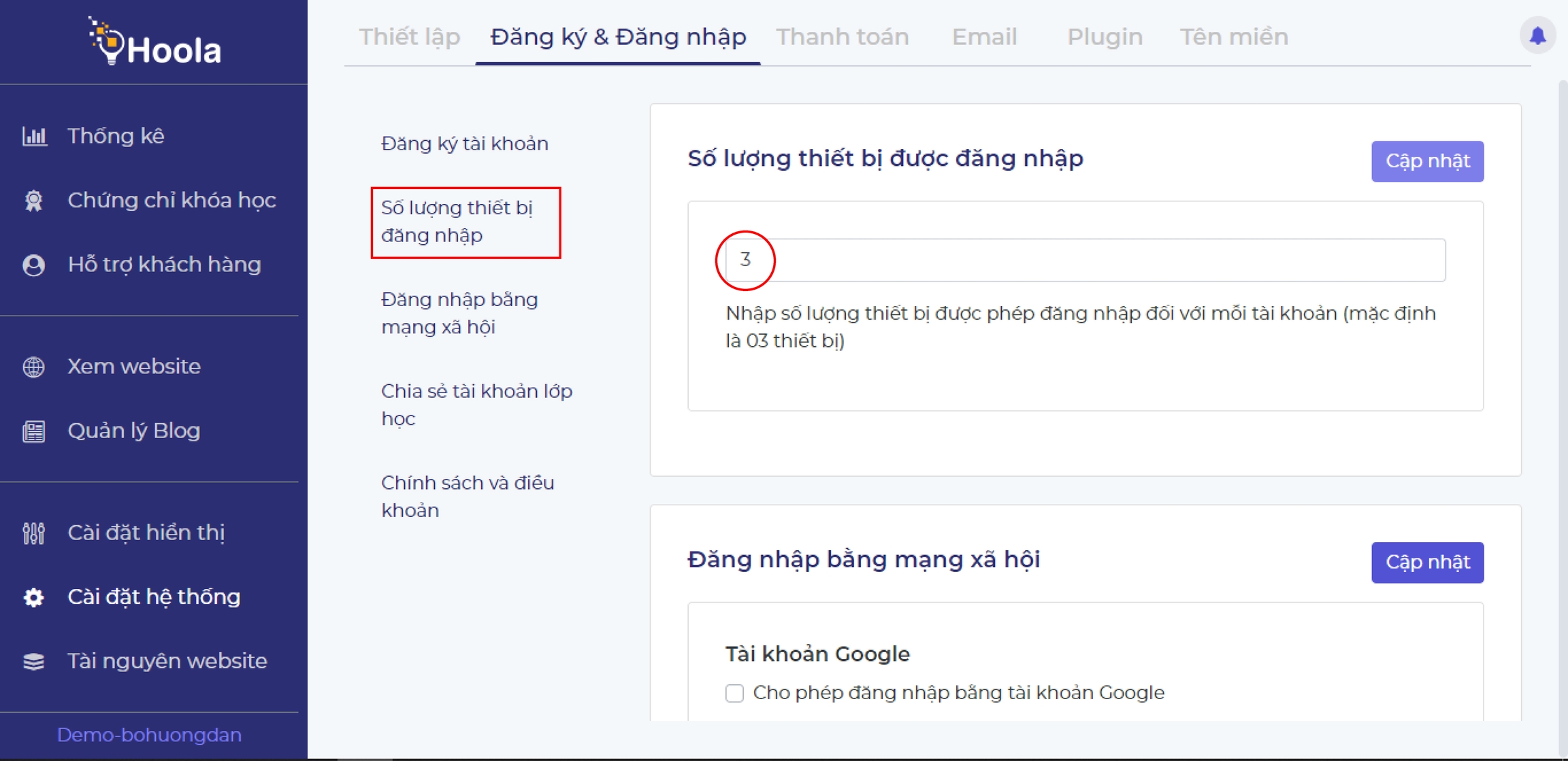 Số thiết bị mà một tài khoản có thể dùng để đăng nhập website. Mặc định sẽ là 03 thiết bị (điện thoại, máy tính bảng và máy tính).