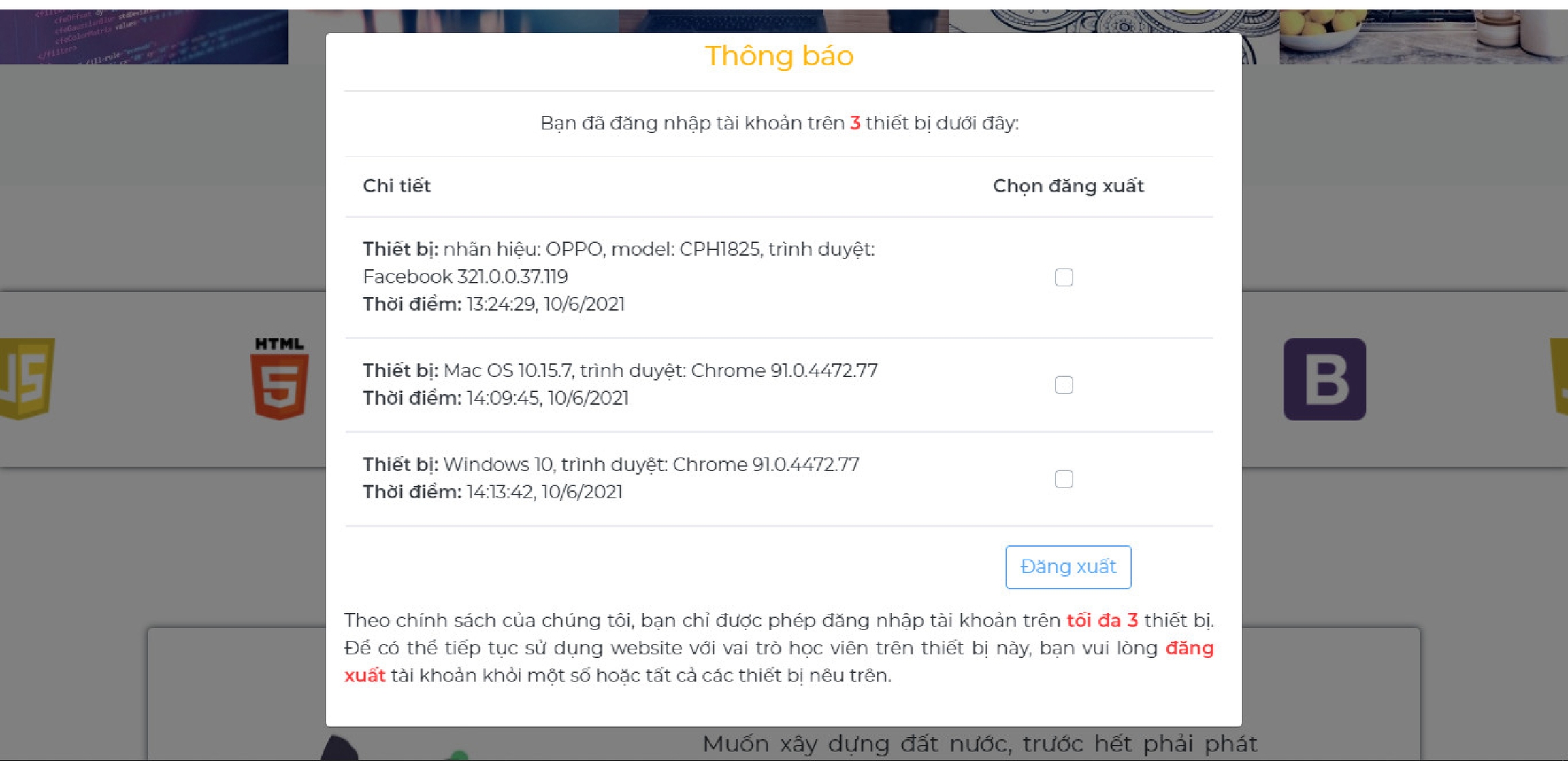 Nếu quá 3 thiết bị để đăng nhập 01 tài khoản, sẽ có thông báo yêu câu thoát một trong các thiết bị cũ. Trong trường hợp ý, học viên cũng được nhận thông báo khuyến cáo đổi mật khẩu nếu như không phải học viên thực hiện hành động này.