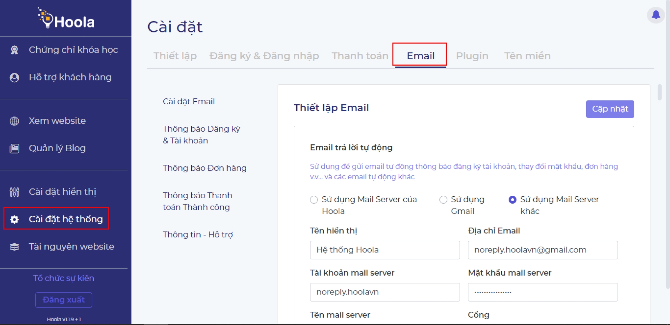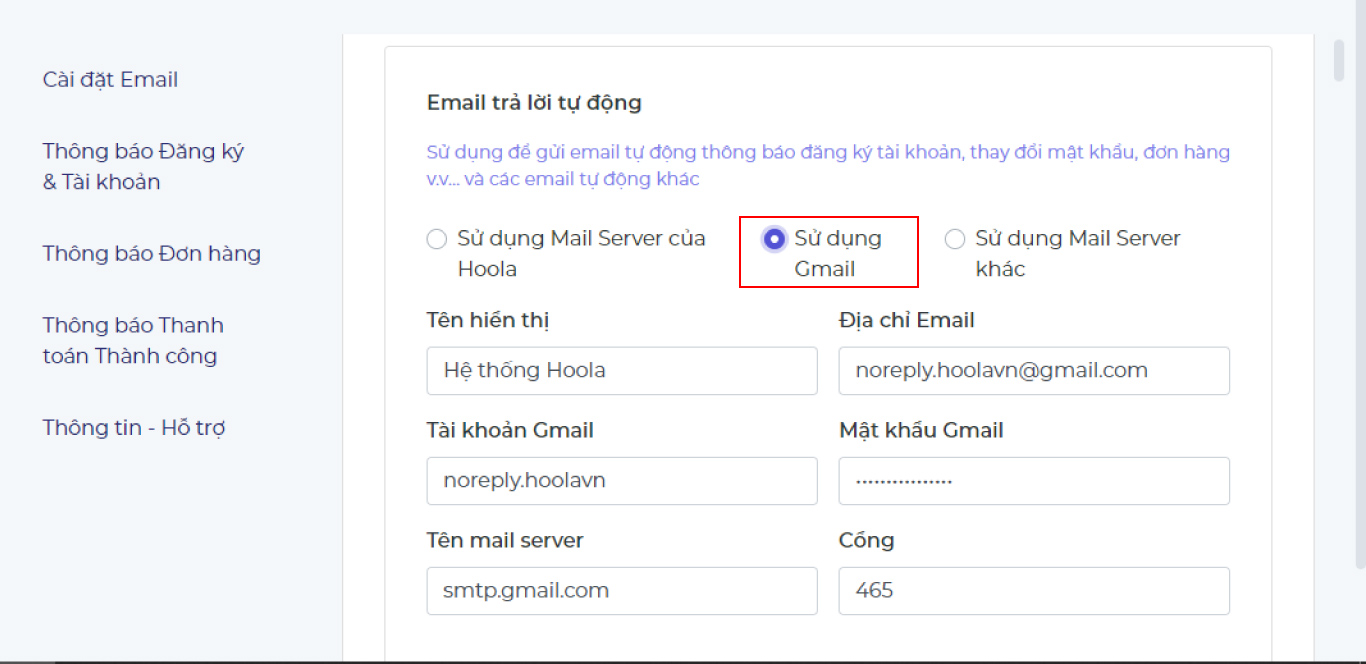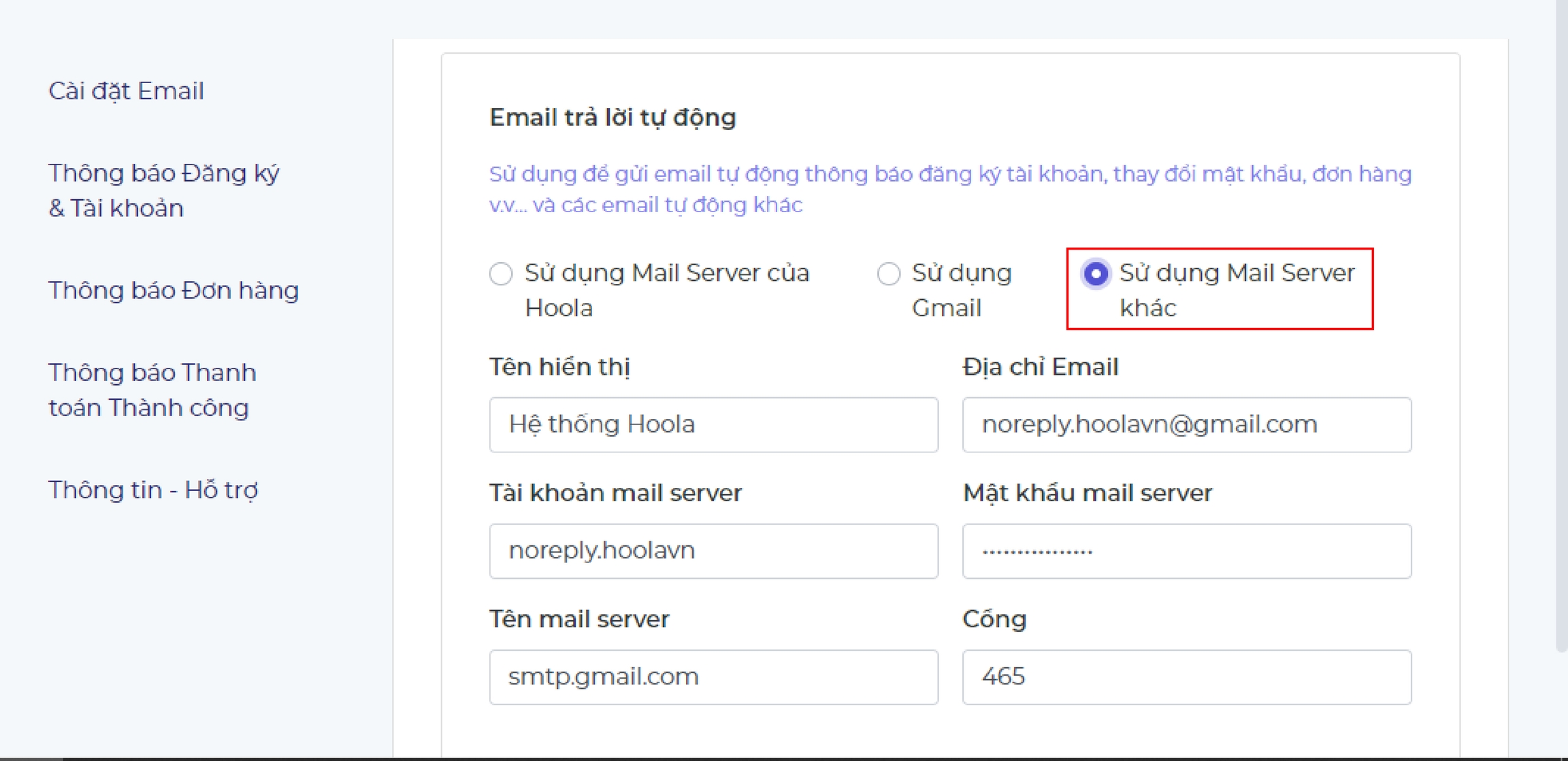 Đây là phần cài đặt gửi Email đi từ hệ thống để gửi thông tin hay thông báo đến cho học viên, ví dụ như Đăng ký/Đăng nhập, Thanh toán đơn hàng,...