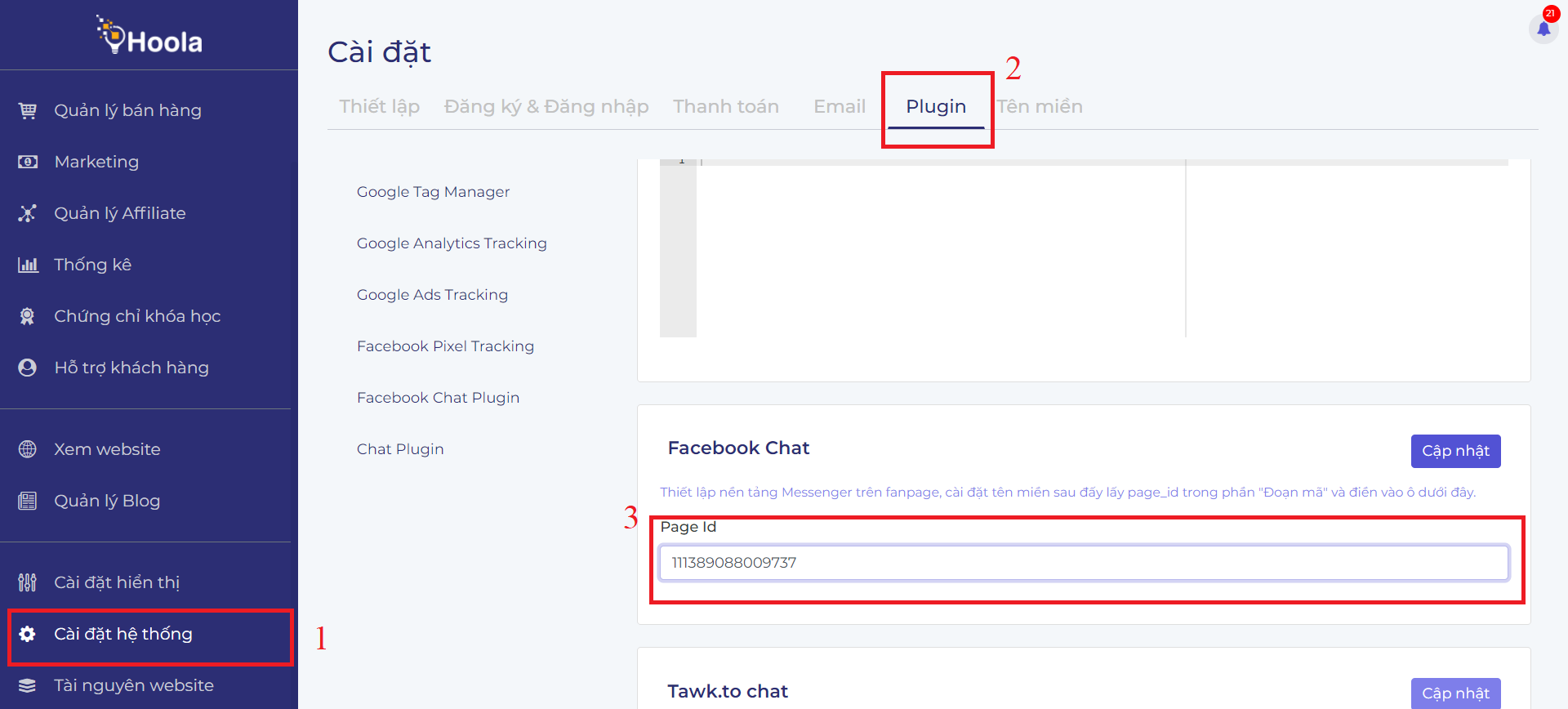 Về trang web của bạn, đi tới mục Quản lý > Cài đặt hệ thống > Plugin. Dán mã bạn vừa copy vào mục Facebook Chat. Nhấn Cập nhật để lưu thông tin.