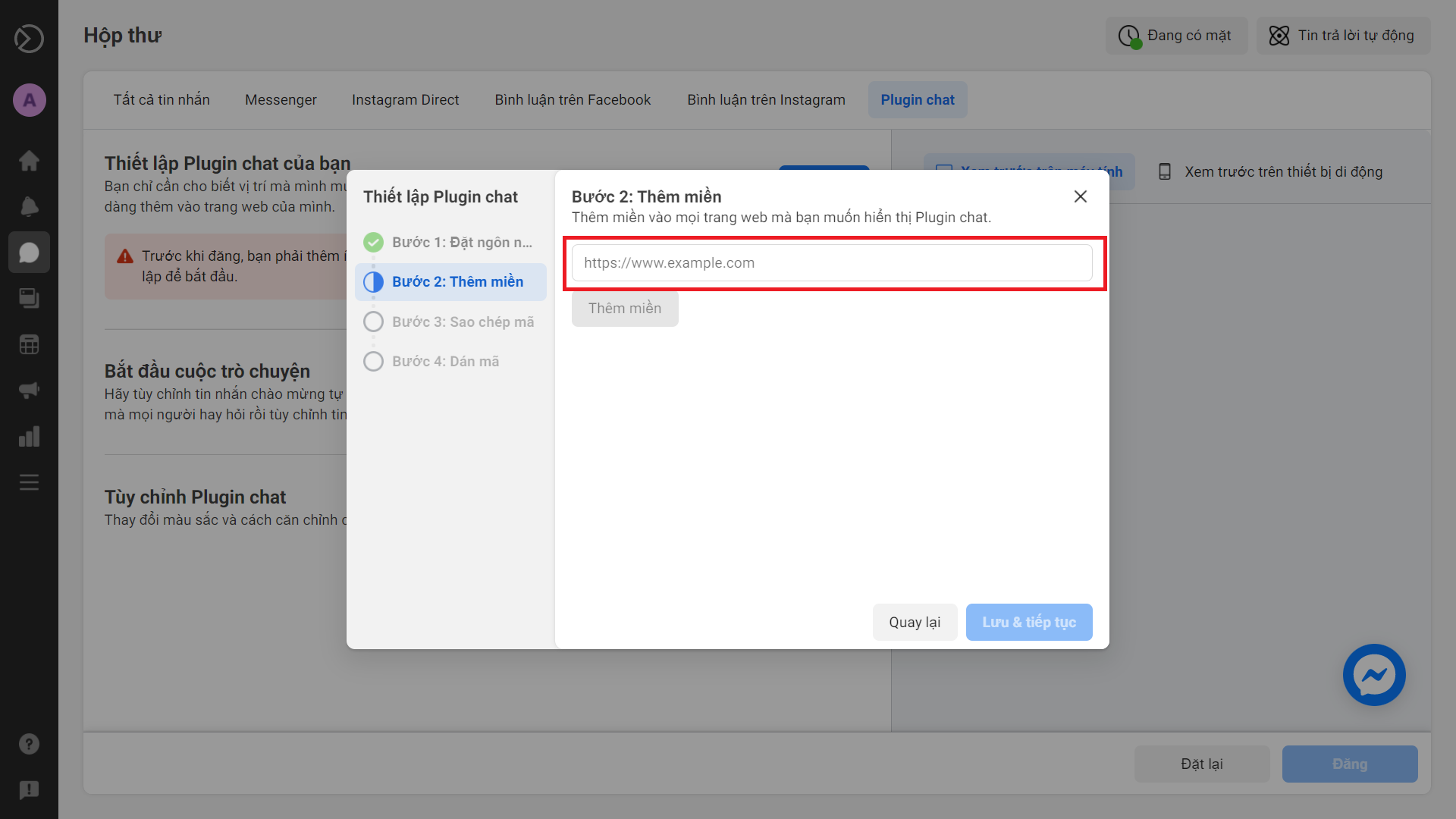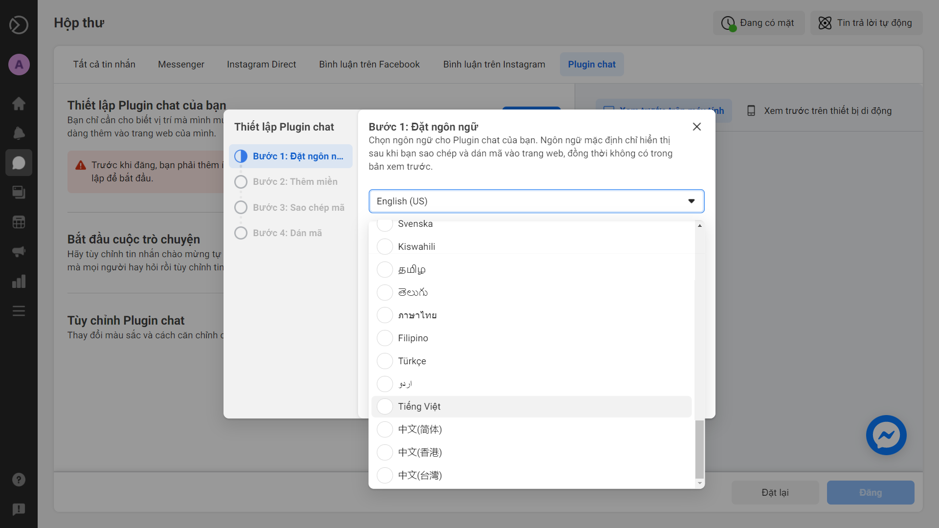 Chọn ngôn ngữ bạn muốn cài đặt cho Plugin chat (ưu tiên Tiếng Việt). Chọn Lưu & tiếp tục.