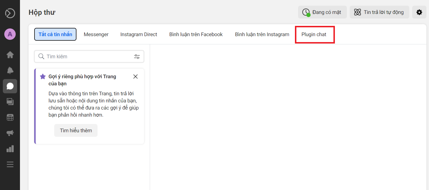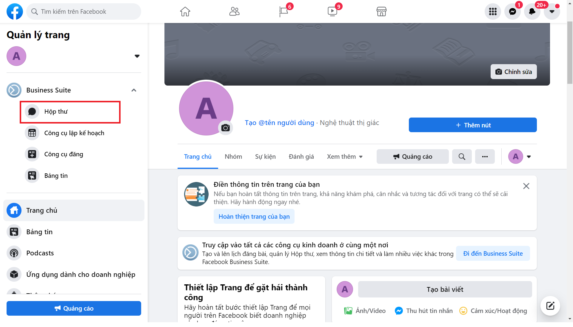 Trước hết, bạn cần có một trang Facebook (Facebook page). Hãy tạo ra một trang nếu bạn chưa có. Vào Trang Facebook của bạn, và chọn Hộp thư ở mục Business Suite.