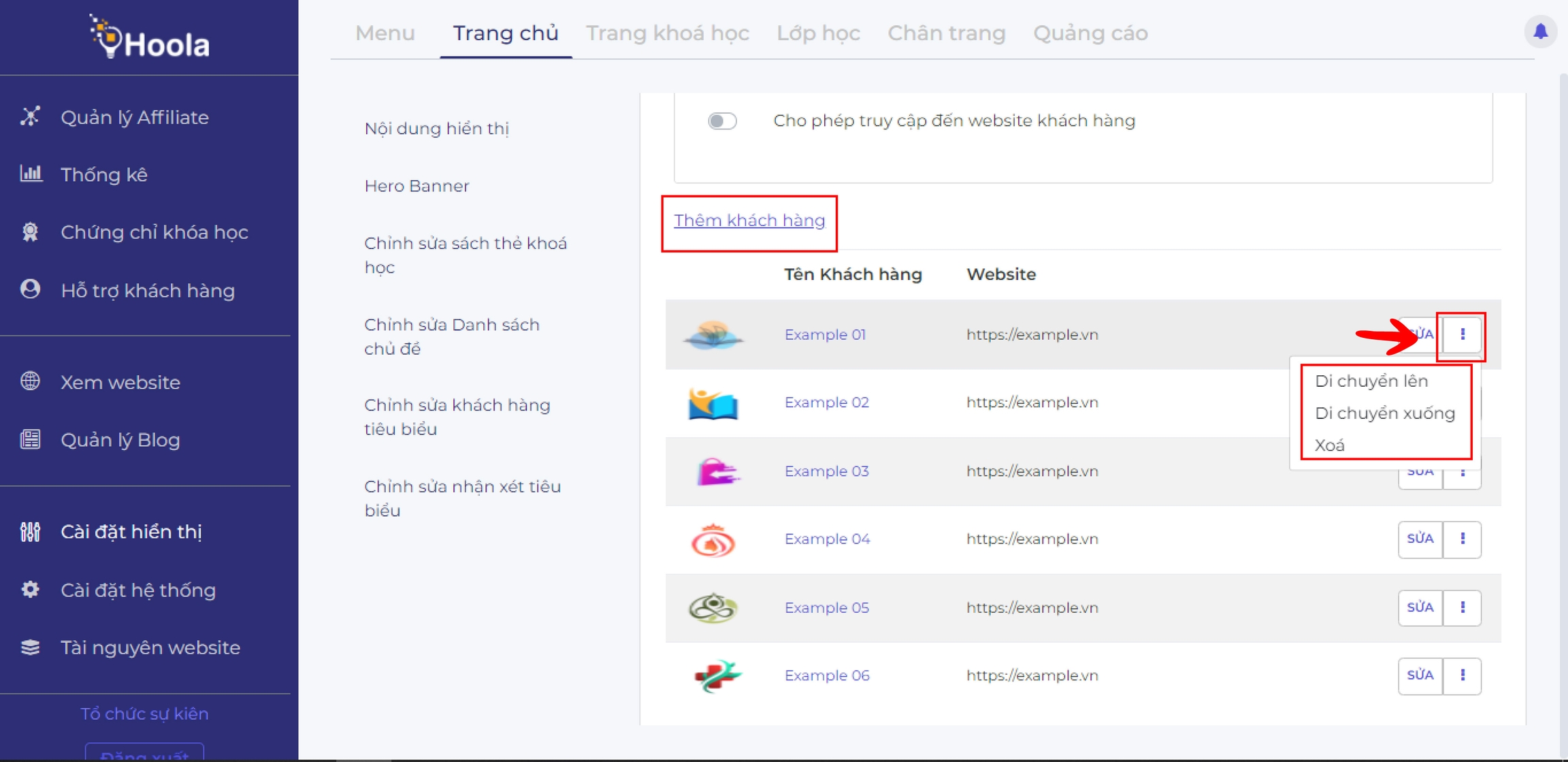 Trong tính năng, khách hàng có thể biến đổi theo nội dung mình muốn, có thể hiển thị những trang web con hay mẹ của website này để tạo đường đãn cho học viên của mình. Ví dụ: Bạn là công ty mẹ, tạo ra nhiều công ty con, một trog các công ty con là lĩnh vực đạo tạo và đang sử dụng nền tảng Hoola, vậy bạn có thể đổi phần tính năng này link đến những trang web của bạn cũng một tập đoàn lớn chẳng hạn.