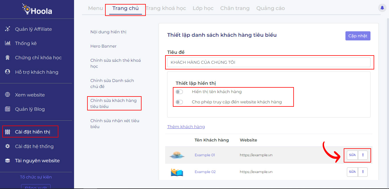 Vào Cài đặt hiện thịTrang chủChỉnh sửa khách hàng tiêu biểu