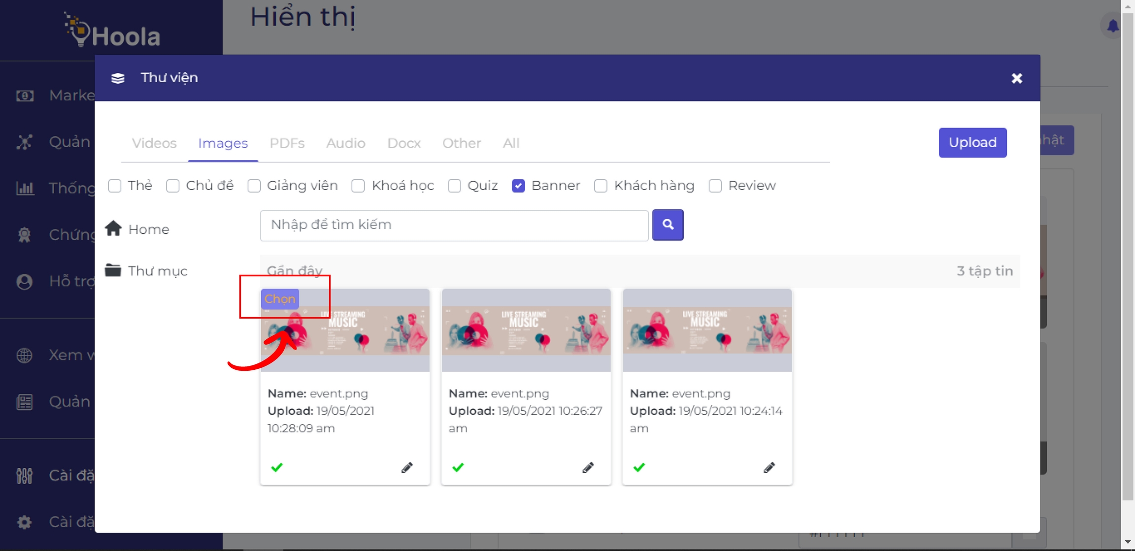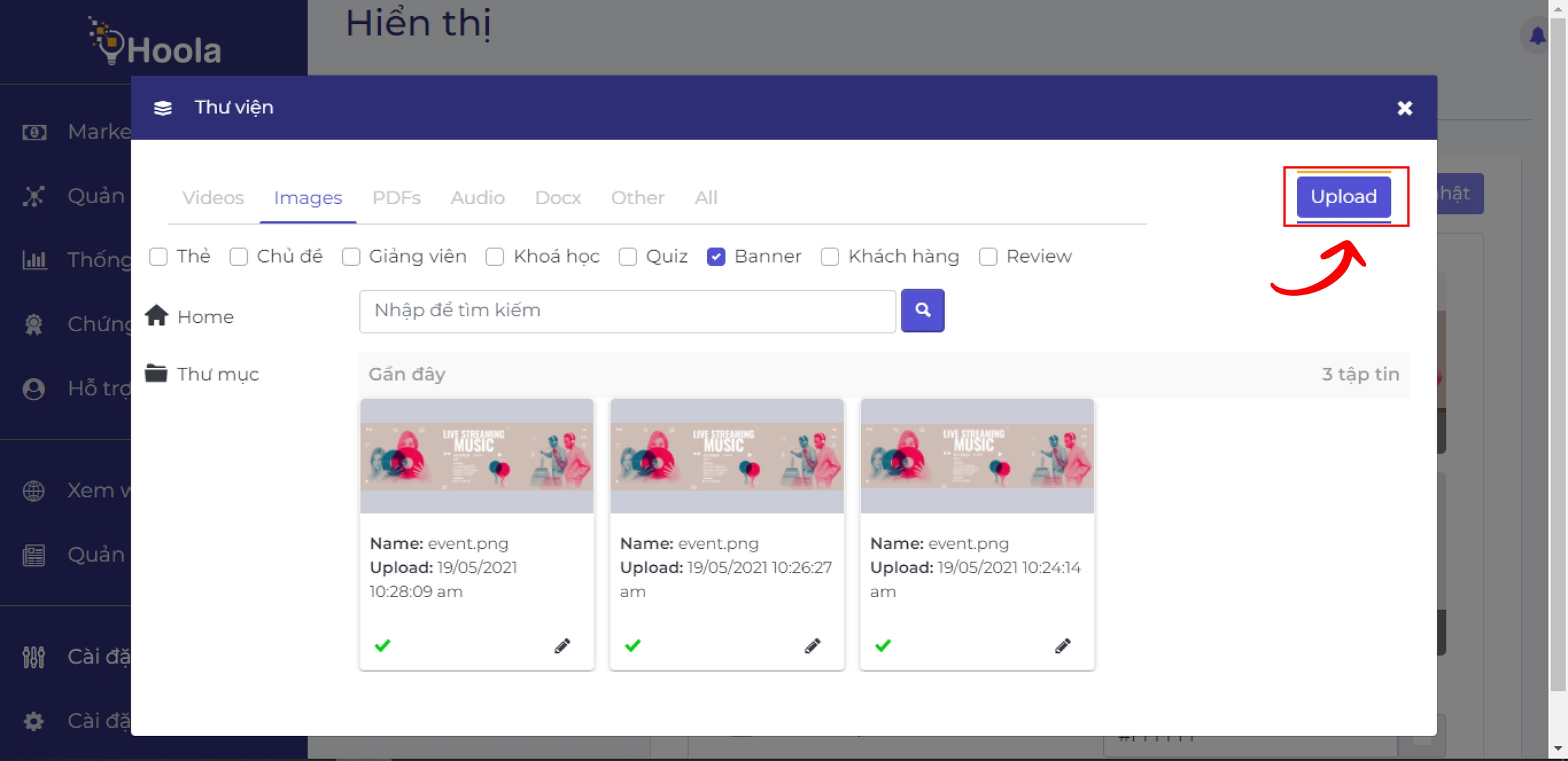 Nhấn Upload để tải hình ảnh banner lên