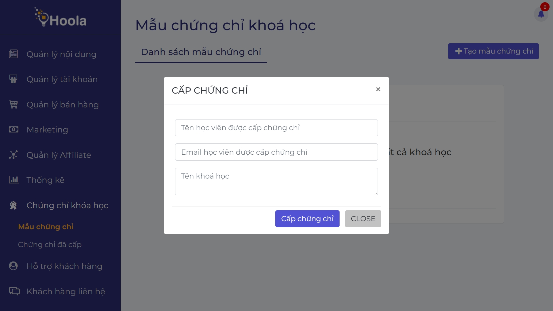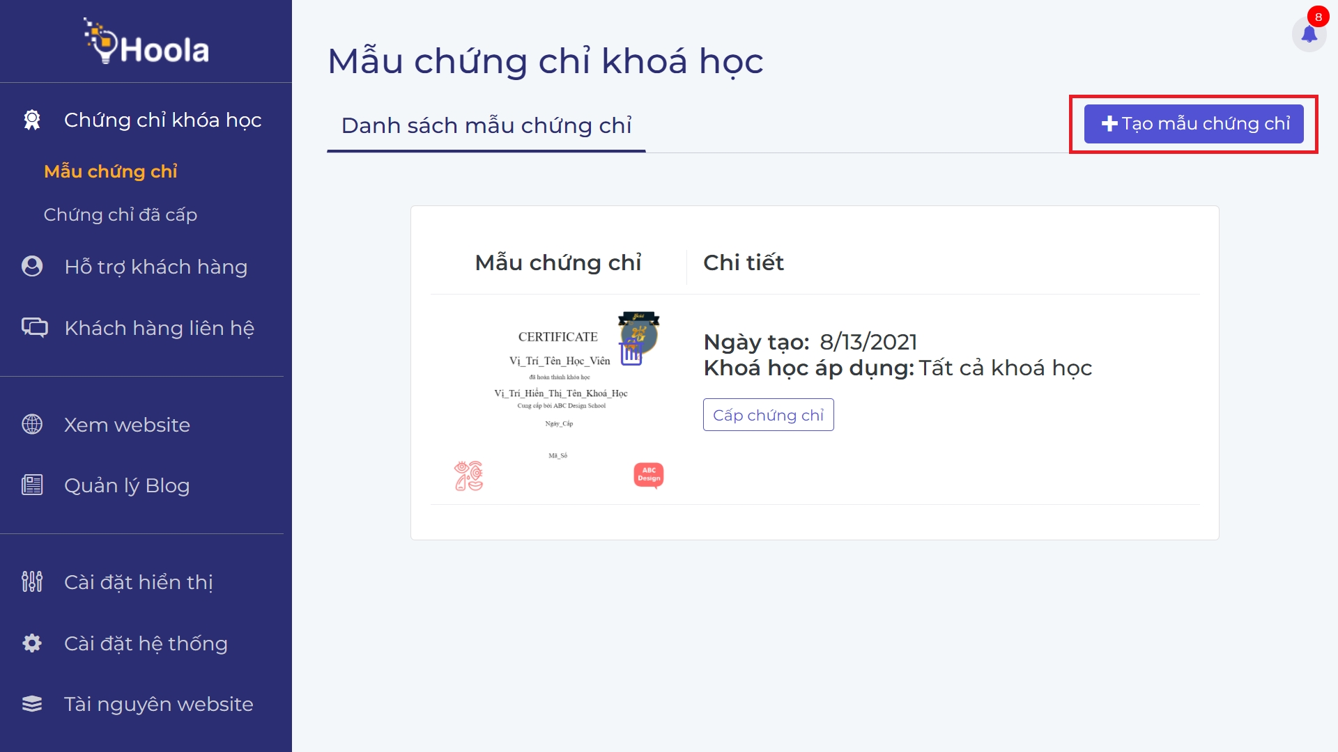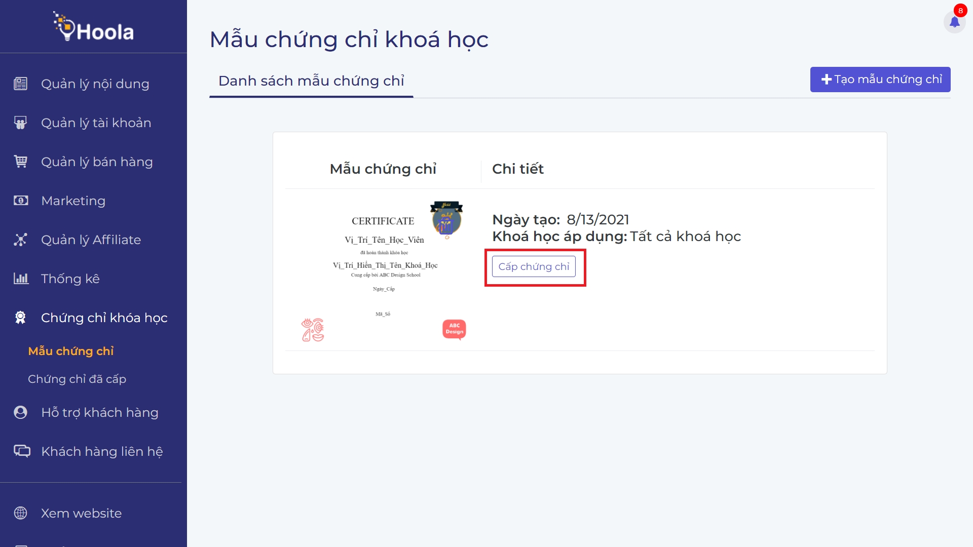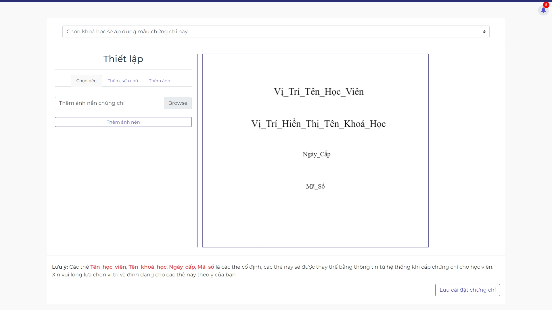Quản trị viên có thể quản lý những mấu chứng chỉ cho khóa học của mình trong Chứng chỉ khóa học