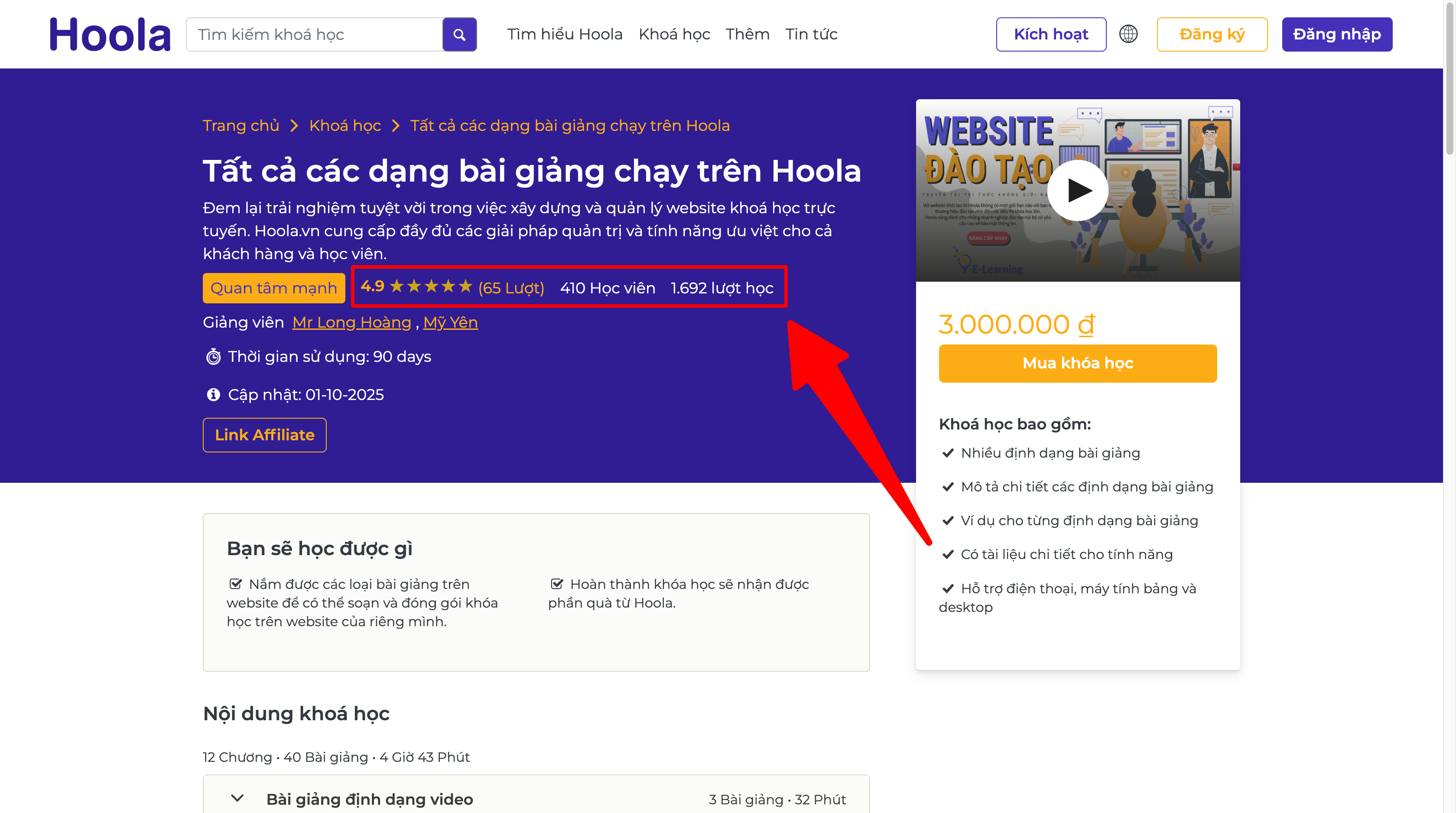 * **Hiển thị lượt mua:** Hiển thị số lượng học viên đã mua khóa học.