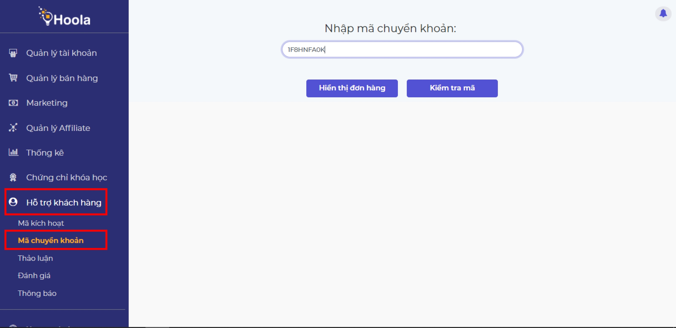 Kiểm tra mã: Kiểm tra mã điền vào có những thông tin đã đúng hay chưa (tổng đơn hàng, khóa học...) đã đúng hay chưa. Trong trường hợp học viên/ quản trị viên gõ nhầm mã thì quản trị viên vẫn có thể tìm ra đơn hàng đấy, sau đó sẽ lấy mã đơn chính xác quay trở lại