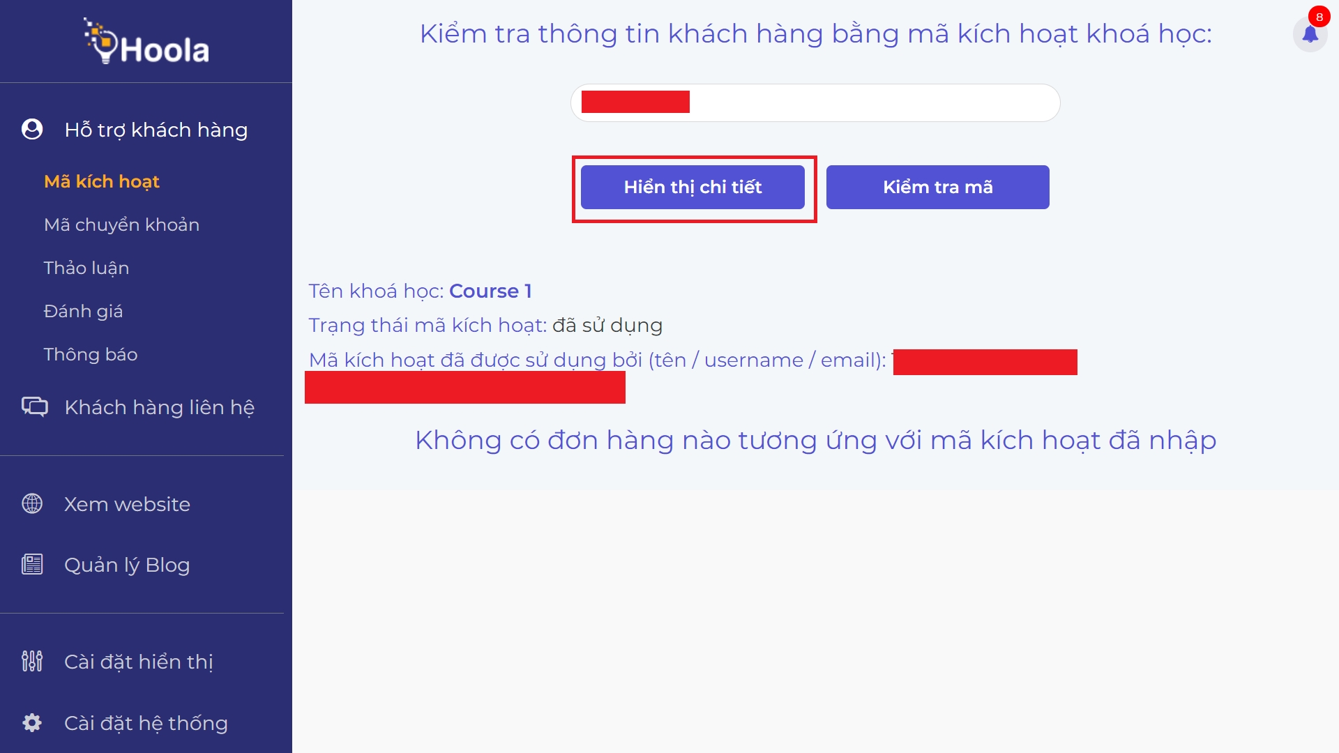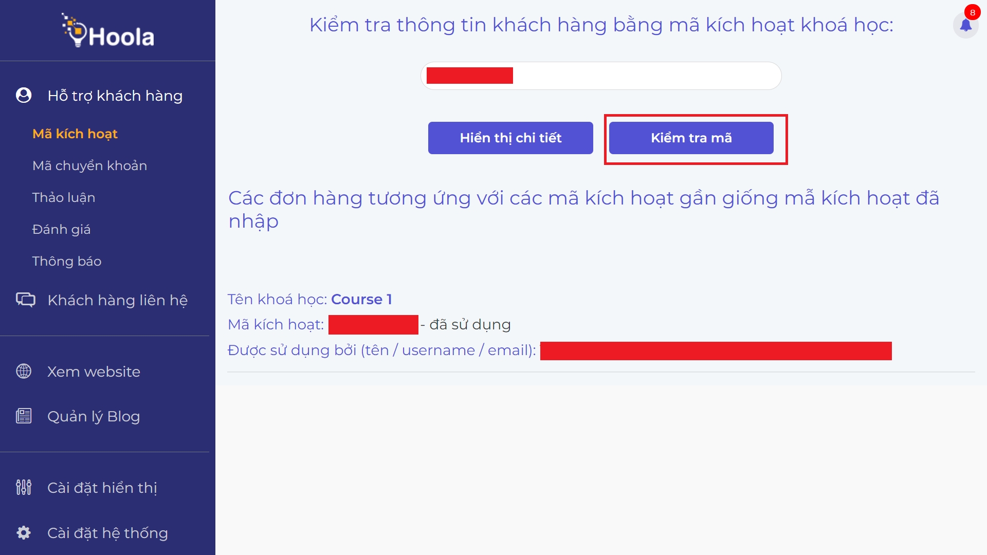 Nếu học viên gặp khó khăn trong việc kích hoạt khóa học bằng Mã kích hoạt, quản trị viên có thể xem chi tiết về mã kích hoạt hoặc kiểm tra mã qua Hỗ trợ khách hàng