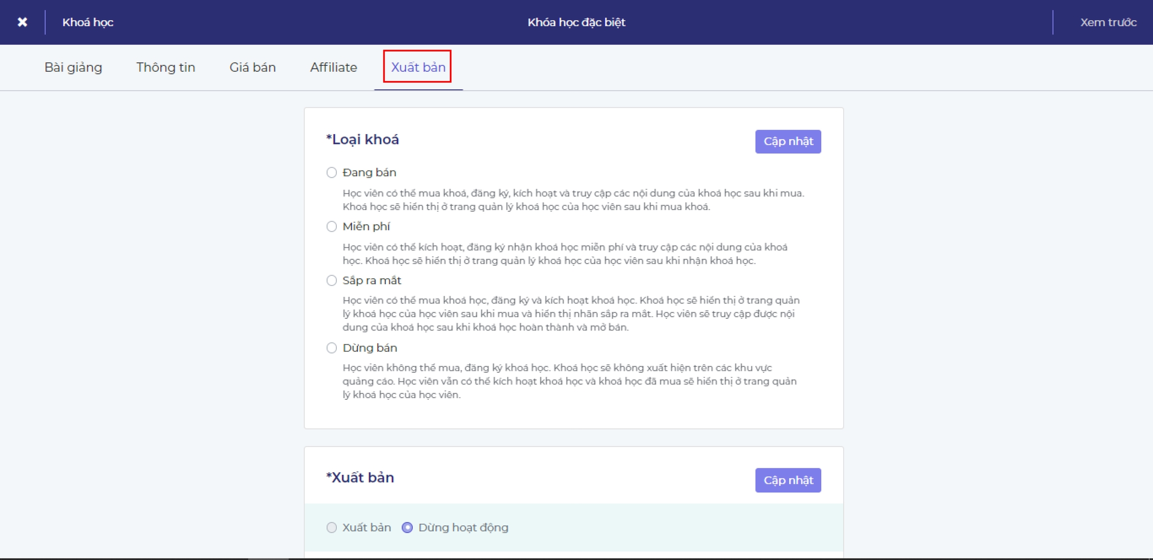 Để cài đặt hình thức này, quản trị chỉ cần chỉnh trong phần 5 mục Xuất bản của Khóa học.